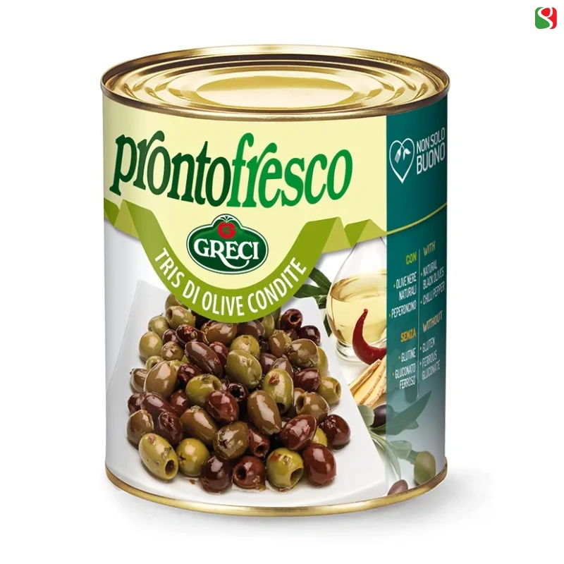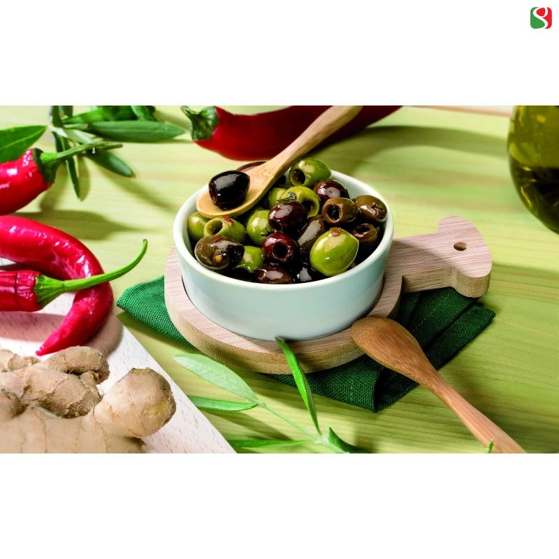 Mixed small pitted olives (green, Nostralino, Coquillo) seasoned with sunflower seed oil. The recipe is enriched with chili pepper, ginger and aromatic herbs which intensify the taste of each olive type.